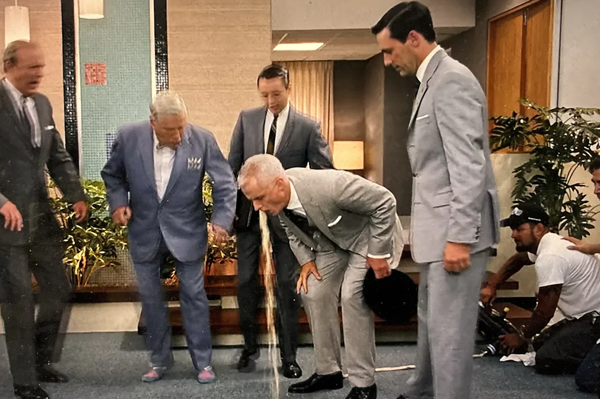 En användare skrev: “The new 4K transfer of Mad Men on HBO somehow does not have any of the post-production edits added in… Which means you get stuff like this where you can see the crew member manning the puke machine after Roger has too many oysters lmao.”